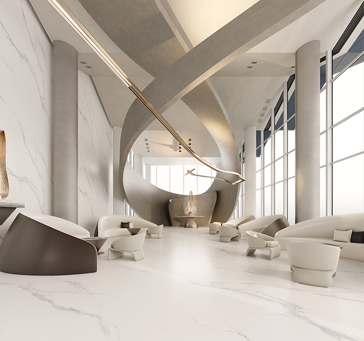 原石材有“石中明珠”的美誉,白得纯粹,高贵优雅。灰纹灵动,惊艳动人。犹如茫茫雪峰展露的山脊线、 犹如泼墨绘画,酣畅而自然。给空间营造出纯净、优雅的氛围。