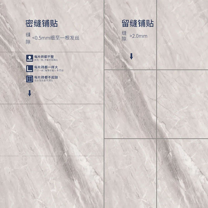 密缝不等于无缝,两砖拼在一起自然缝≤0.5mm就叫密缝,别小看这0.5mm,这背后是跨越瓷砖与大理石之间的那道鸿沟。相比于石材领域的密缝铺贴,传统瓷砖铺贴需要留缝1-3mm,以前是靠牺牲整体美感,在砖与砖之间留缝,才能确保使用安全,现在简品大理石瓷砖密缝铺贴,打破了鱼和熊掌不可兼得的固有认知,做到了既美观又安全。