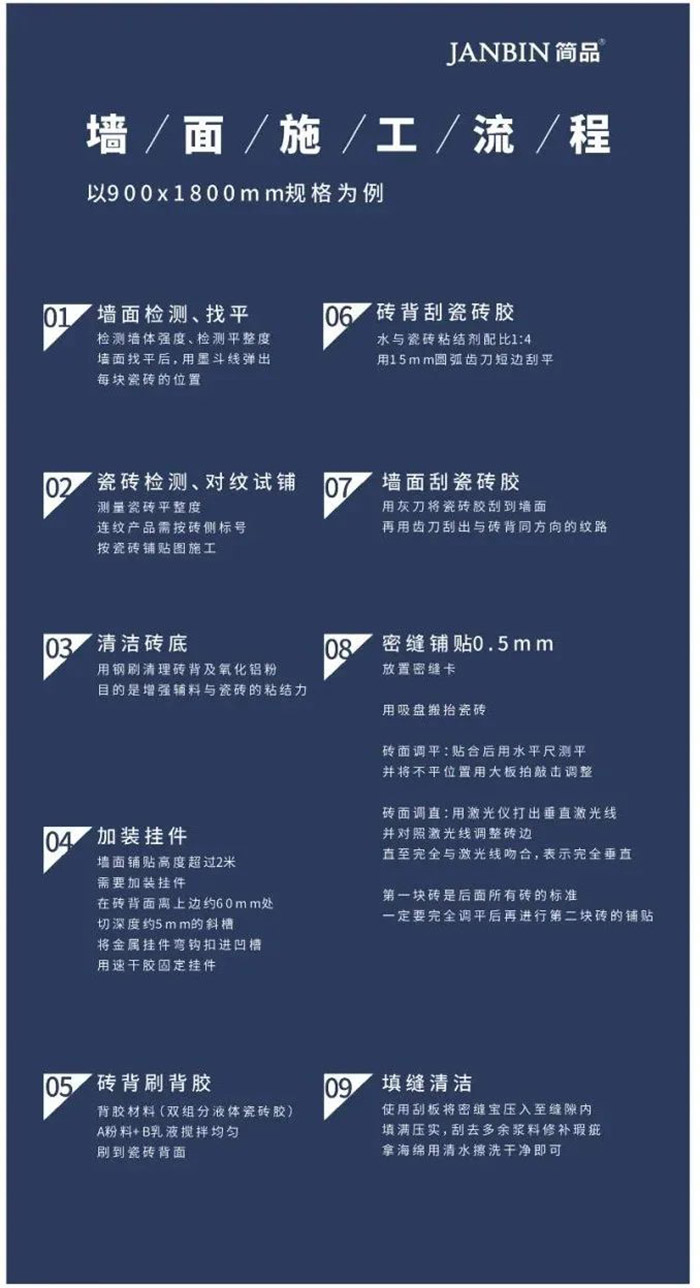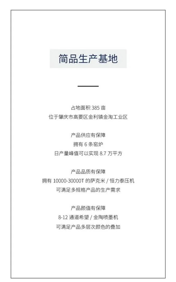 简品秉承【做更好的大理石瓷砖】的品牌理念,在大理石瓷砖系统生产工程上精益求精,从生产工艺和设备,到釉料墨水等原材料,再到瓷砖花色的设计开发等,都追求严苛的品质。品牌在广东肇庆市拥有占地385亩的现代化生产基地,拥有先进的8-12 通道希望 / 金陶高清喷墨机、415米超长宽体窑炉、10000-30000T 的萨克米 / 恒力泰压机、全新瓷砖智能检测系统等先进的生产设备,保证每一片大理石瓷砖的优越性能,质感堪比天然石材。简品作为行业集产、销、研一体的综合性企业,聚焦深耕大理石瓷砖品类,目前已生产600X1200mm、900X1800mm和900X2700mm等规格产品,可以满足不同消费者的选购需求。