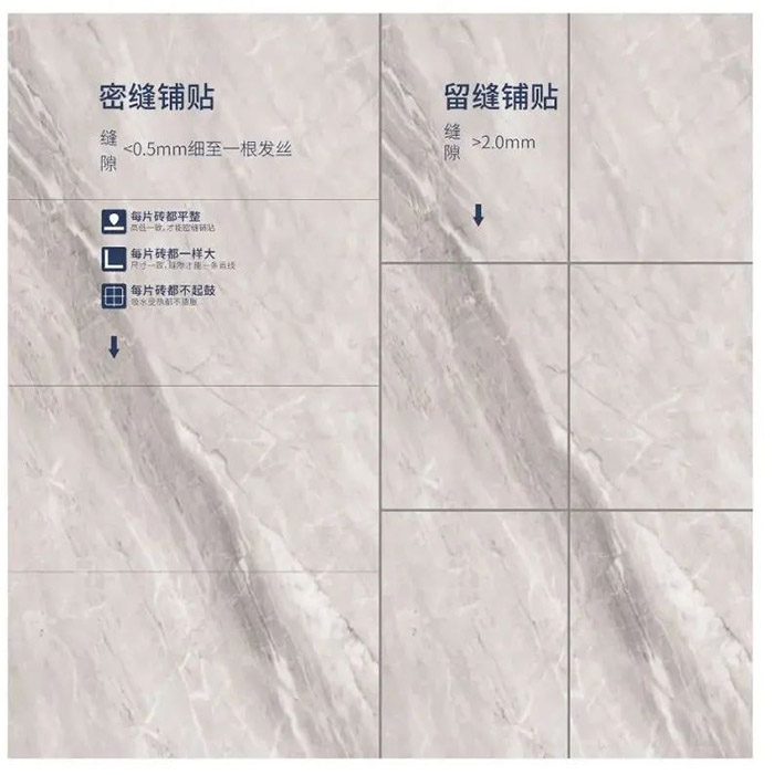 相比于石材领域的密缝铺贴,传统瓷砖铺贴需要留缝1-3mm以前是靠牺牲整体美感,在砖与砖之间留缝,才能确保使用安全现在简品密缝铺贴,打破了鱼和熊掌不可兼得的固有认知,做到了既美观又安全