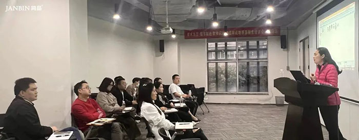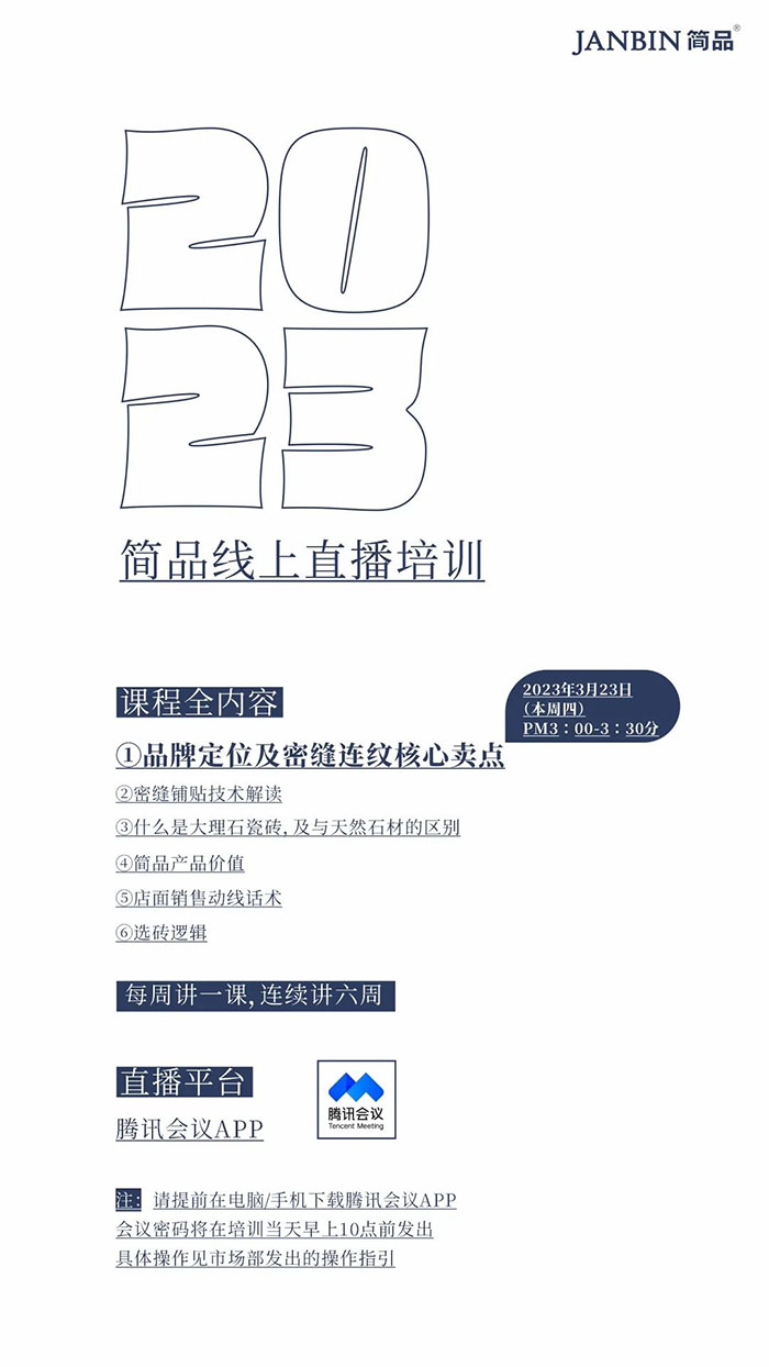 为进一步提升品牌认知能力,终端销售,打造顾问式优质服务体验,将简品密缝与连纹大理石瓷砖更好落地终端,走进千家万户。近期,简品总部组织全国经销商,开展为期六周的线上直播培训。同时,简品市场部也前往深圳惠泉开展线下培训。